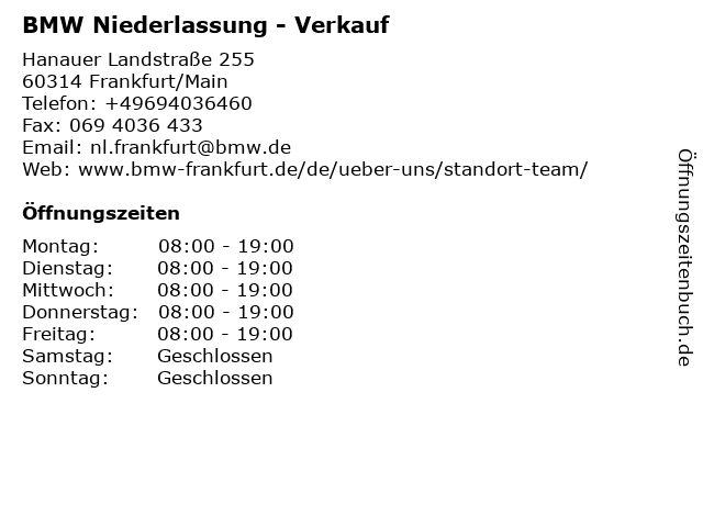 2 BMW Niederlassung Frankfurt - Großkunden-Zentrum (Entfernung: 0,09 km) Hanauer Landstraße 182, 60314 Frankfurt/Main 3 BMW Motorrad Zentrum Frankfurt - Verkauf, Teile und Zubehör und Botique (Entfernung: 0,16 km) Hanauer Landstrasse 182, 60314 Frankfurt 4 BMW Motorrad Zentrum Frankfurt - Service (Entfernung: 0,16 km) Hanauer Landstrasse 182, 60314 Frankfurt 5 Aufzugswerke Schmitt + Sohn GmbH & Co. KG - Niederlassung (Entfernung: 0,69 km) Riederhofstraße 16/18, 60314 Frankfurt am Main 6 Alpha Personalmanagement GmbH Niederlassung Frankfurt Zeitarbeit (Entfernung: 2,81 km) Stephanstraße 13, 60313 Frankfurt |