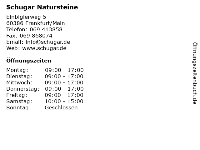 | Öffnungszeiten Schugar Natursteine in Frankfurt/Main anzeigen | |