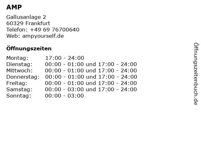 | Öffnungszeiten AMP in Frankfurt anzeigen | |