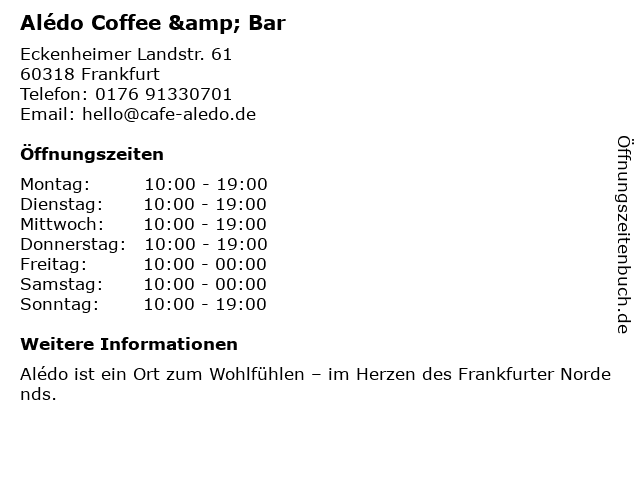 | Öffnungszeiten Alédo Coffee & Bar in Frankfurt anzeigen | |