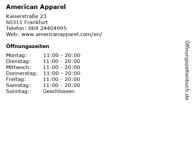 | Öffnungszeiten American Apparel in Frankfurt anzeigen | |