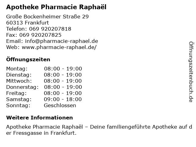 Öffnungszeiten Apotheke Pharmacie Raphaёl in Frankfurt anzeigen | |
