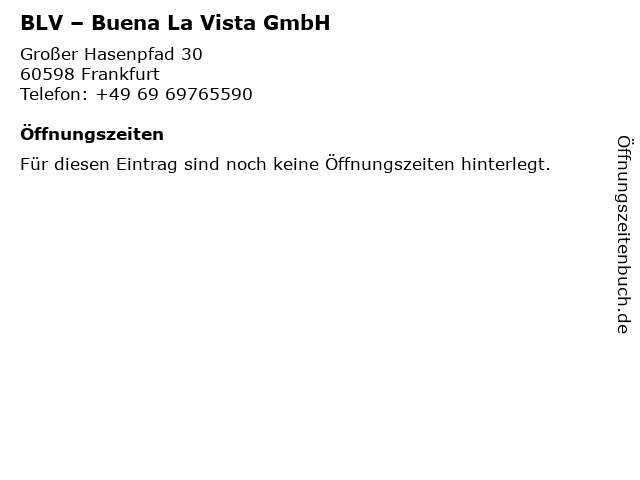 | Öffnungszeiten BLV – Buena La Vista GmbH in Frankfurt anzeigen | |