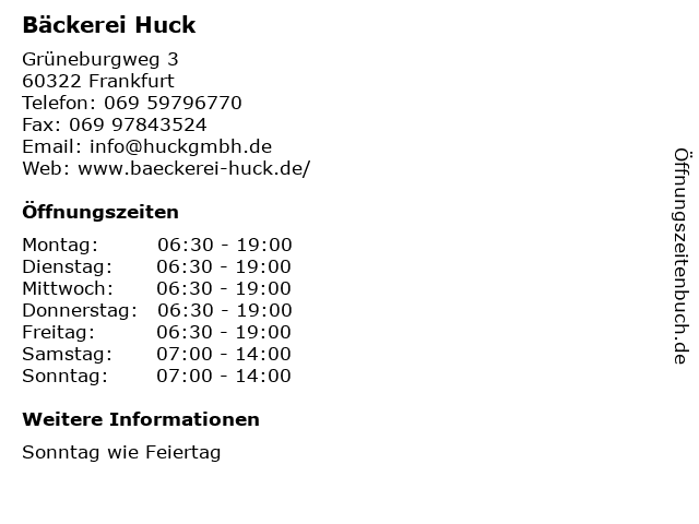 | Öffnungszeiten Bäckerei Huck in Frankfurt anzeigen | |