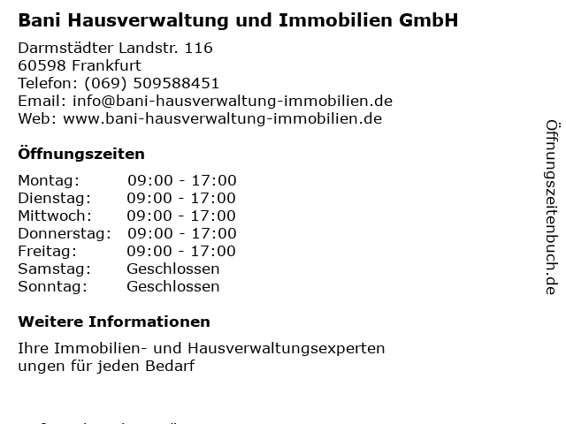 Branchen & Suchbegriffe zu Bani Hausverwaltung und Immobilien GmbH:bani, gebäudeverwaltung, hausverwaltung, hausverwaltungen, immobilien, immobilienverkauf, vermietung von immobilien, wohnungsvermietungen |