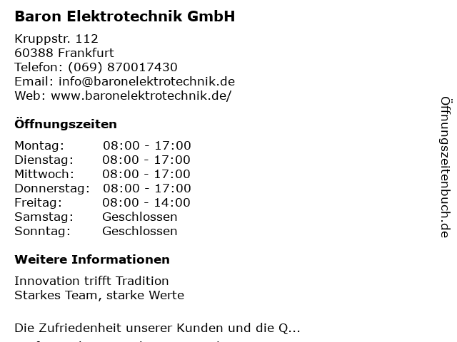 | Öffnungszeiten Baron Elektrotechnik GmbH in Frankfurt anzeigen | |