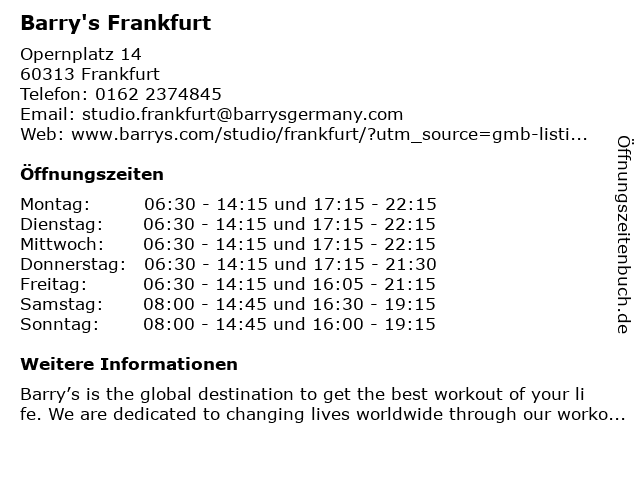 | Öffnungszeiten Barry's Frankfurt in Frankfurt anzeigen | |