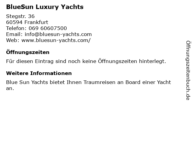 | Öffnungszeiten BlueSun Luxury Yachts in Frankfurt anzeigen | |