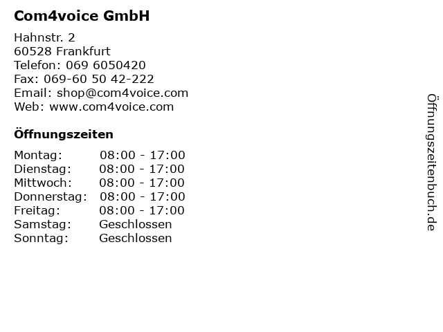 | Öffnungszeiten Com4voice GmbH in Frankfurt anzeigen | |