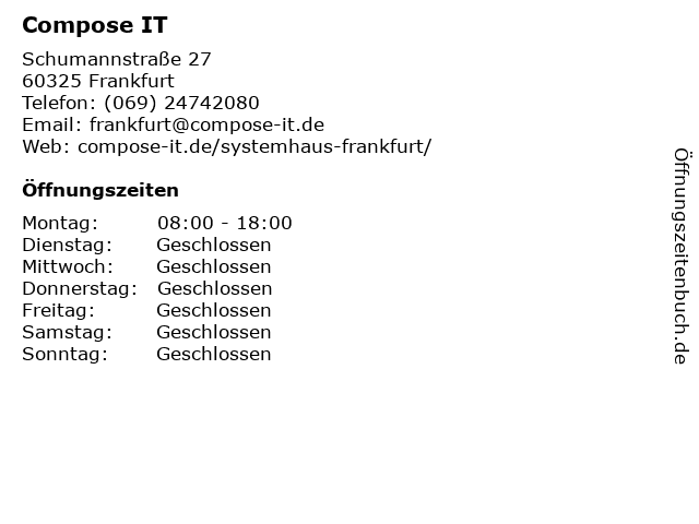 | Öffnungszeiten Compose IT in Frankfurt anzeigen | |