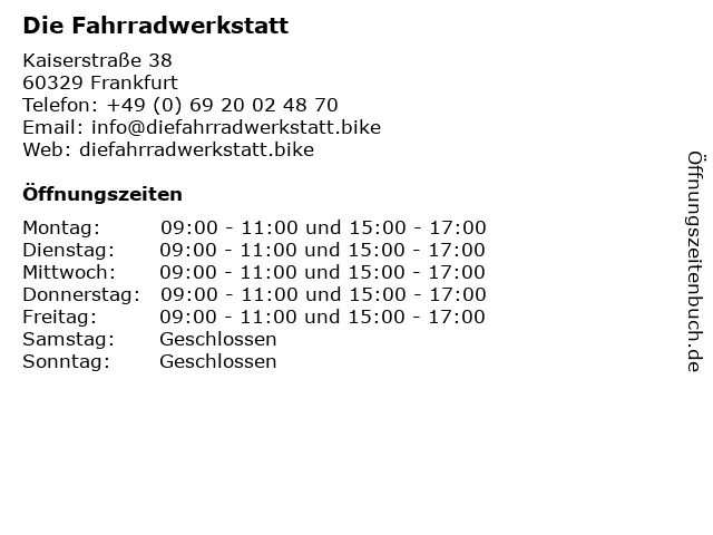 | Öffnungszeiten Die Fahrradwerkstatt in Frankfurt anzeigen | |