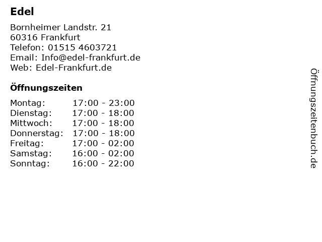 | Öffnungszeiten Edel in Frankfurt anzeigen | |