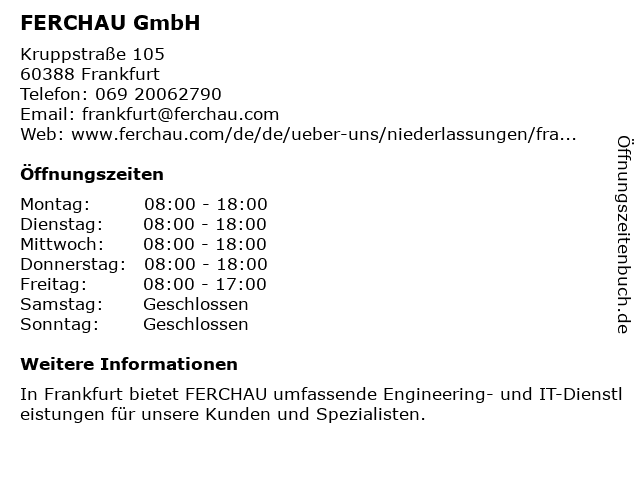 | Öffnungszeiten FERCHAU GmbH in Frankfurt anzeigen | |