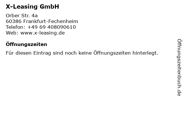 | Öffnungszeiten X-Leasing GmbH in Frankfurt-Fechenheim anzeigen | |