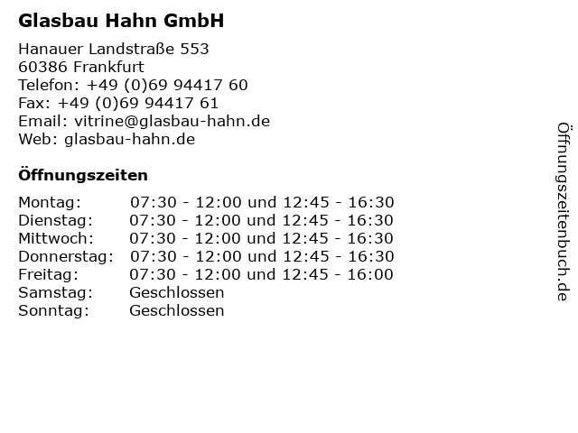 | Öffnungszeiten Glasbau Hahn GmbH in Frankfurt anzeigen | |