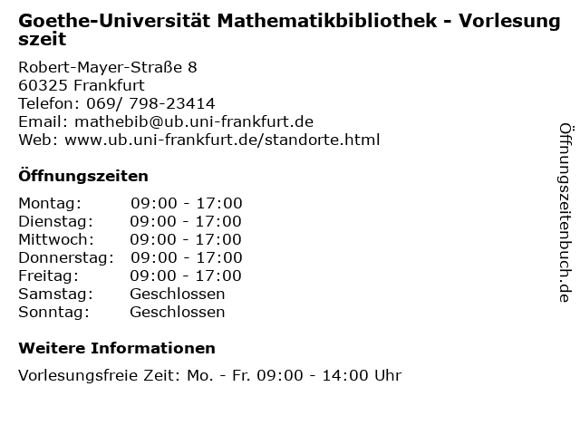 Branchen & Suchbegriffe zu Goethe-Universität Mathematikbibliothek - Vorlesungszeit:bibliothek, buch, buchscanner, goethe, literaturen, main, mathematikbibliothek, sprachen, universität, vorlesungszeit |