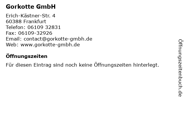 | Öffnungszeiten Gorkotte GmbH in Frankfurt anzeigen | |