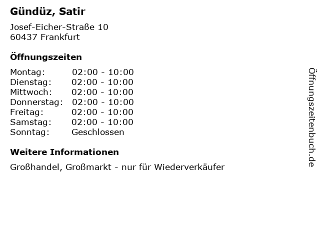 | Öffnungszeiten Gündüz, Satir in Frankfurt anzeigen | |