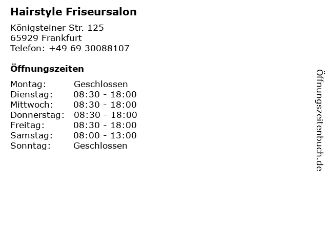 | Öffnungszeiten Hairstyle Friseursalon in Frankfurt anzeigen | |
