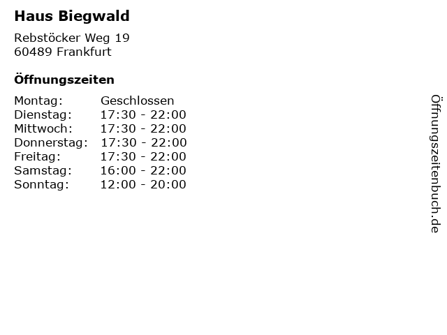 | Öffnungszeiten Haus Biegwald in Frankfurt anzeigen | |