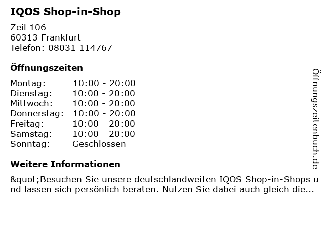 | Öffnungszeiten IQOS Shop-in-Shop in Frankfurt anzeigen | |