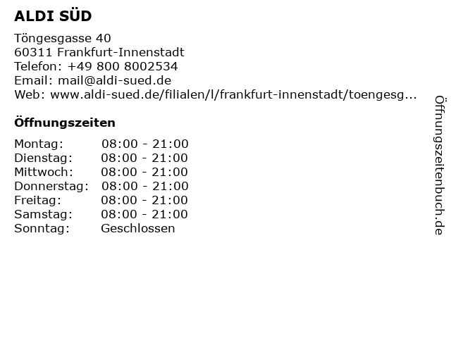 | Öffnungszeiten ALDI SÜD in Frankfurt-Innenstadt anzeigen | |