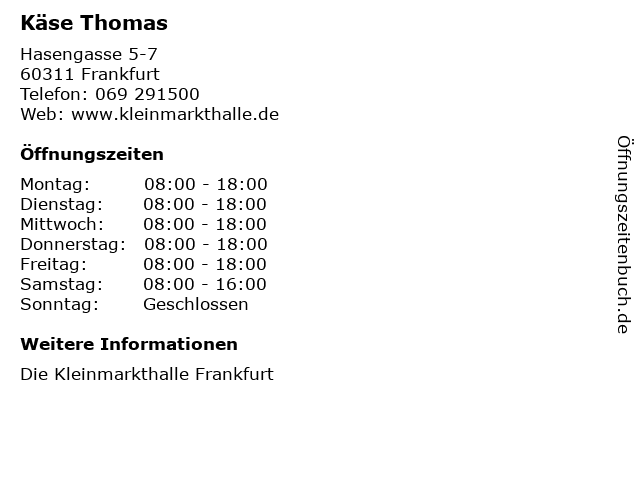 | Öffnungszeiten Käse Thomas in Frankfurt anzeigen | |