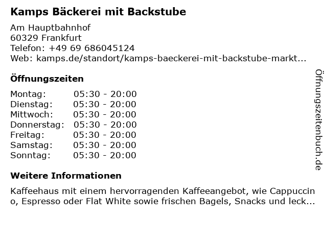 6 Kamps Bäckerei mit Backstube (Entfernung: 13,50 km) Louisenstraße 86-90, 61348 Bad Homburg vor der Höhe |