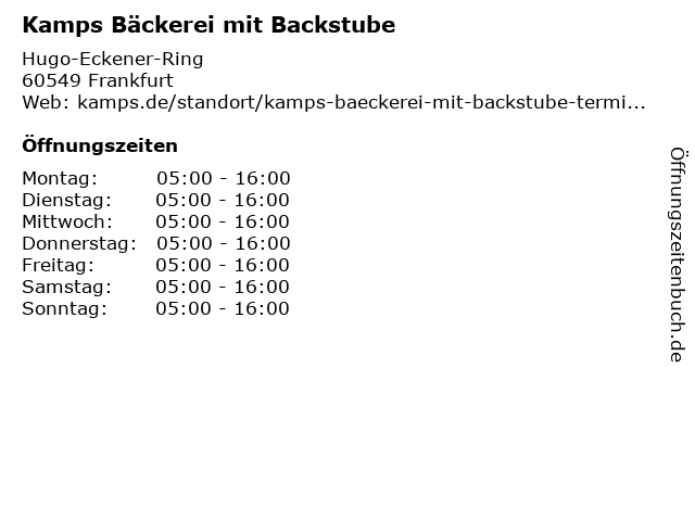 | Öffnungszeiten Kamps Bäckerei mit Backstube in Frankfurt anzeigen | |