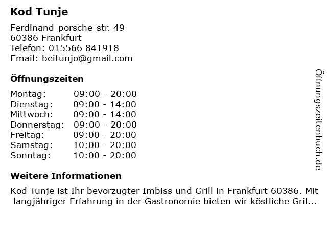 | Öffnungszeiten Kod Tunje in Frankfurt anzeigen | |
