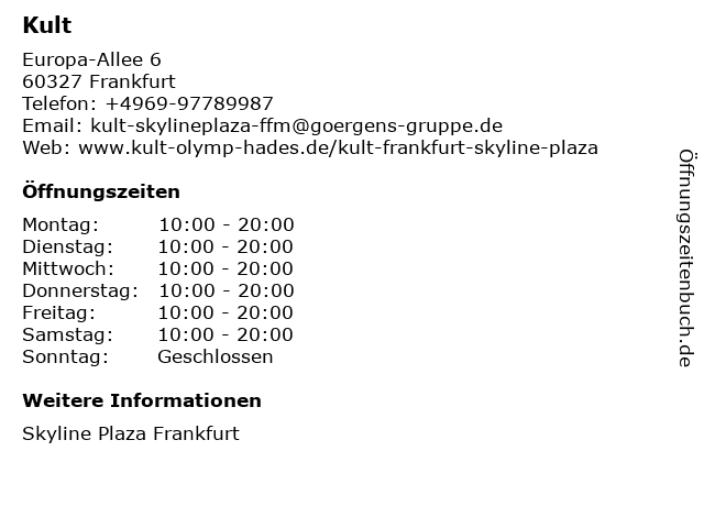 | Öffnungszeiten Kult in Frankfurt anzeigen | |