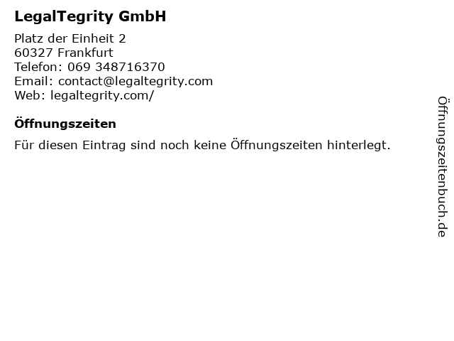 | Öffnungszeiten LegalTegrity GmbH in Frankfurt anzeigen | |