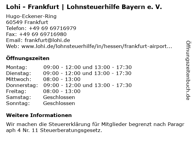 1 Lohi - Frankfurt | Lohnsteuerhilfe Bayern e. V. (Entfernung: 7,94 km) Riedrain 2, 65936 Frankfurt am Main 2 Lohi - Frankfurt | Lohnsteuerhilfe Bayern e. V. (Entfernung: 10,35 km) Walter-Kolb-Straße 9-11, 60594 Frankfurt am Main 6  |