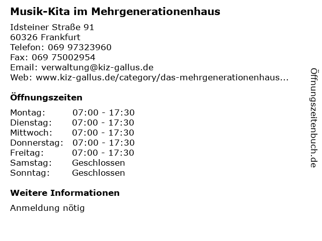 5 deutsch-französcische Kita des des C.E.F.A. e.V. (Entfernung: 2,83 km) Lorscher Straße 20, 60489 Frankfurt 6 Oster-Kita der evangelischen Maria-Magdalena-Gemeinde (Entfernung: 3,39 km) Stresemannallee 71-73, 60596 Frankfurt |