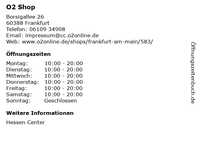 | Öffnungszeiten O2 Shop in Frankfurt anzeigen | |