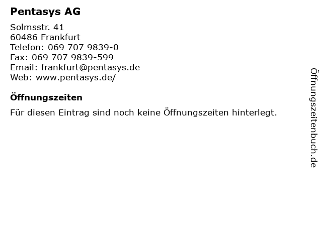 | Öffnungszeiten Pentasys AG in Frankfurt anzeigen | |