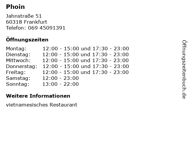 | Öffnungszeiten Phoin in Frankfurt anzeigen | |