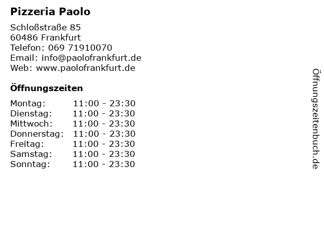 | Öffnungszeiten Pizzeria Paolo in Frankfurt anzeigen | |