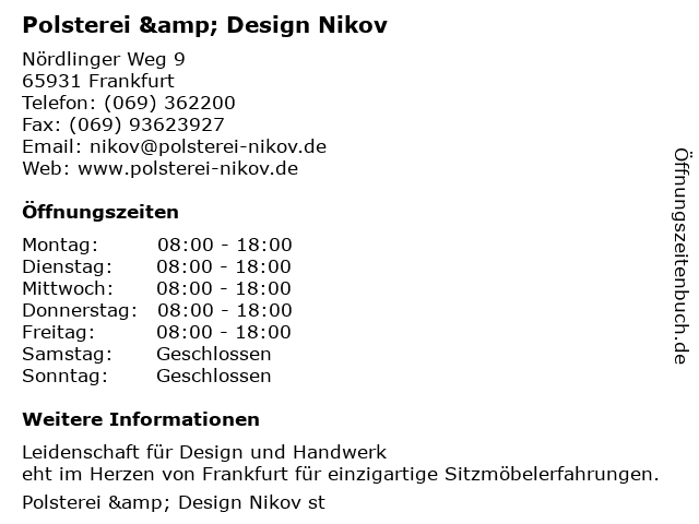 Öffnungszeiten Polsterei & Design Nikov in Frankfurt anzeigen | |