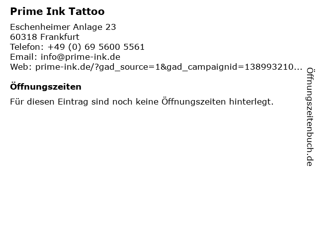 | Öffnungszeiten Prime Ink Tattoo in Frankfurt anzeigen | |