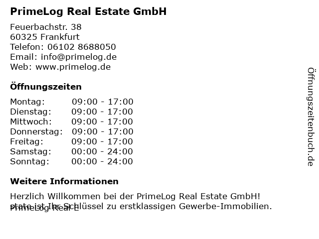 | Öffnungszeiten PrimeLog Real Estate GmbH in Frankfurt anzeigen | |