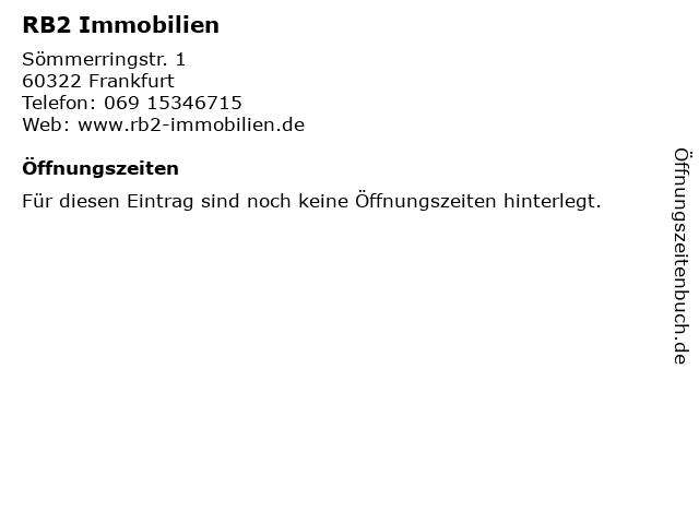 | Öffnungszeiten RB2 Immobilien in Frankfurt anzeigen | |