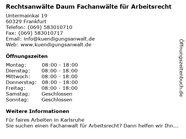 1 Klaus-Jürgen Meissner Fachanwalt für Arbeitsrecht (Entfernung: 0,32 km) Kaiserstr. 47, 60329 Frankfurt 2 Fachanwalt Arbeitsrecht Frankfurt Kanzlei Regina Manz (Entfernung: 0,40 km) Kaiserstr. 61, 60329 Frankfurt 3 Arbeitsrecht, Insolvenzrecht und Zivilrecht - Rechtsanwalt Kristian Hillebrecht - Frankfurt (Entfernung: 0,50 km) Taunustor 1, 60310 Frankfurt am Main 4 80::DREI - Kanzlei für Arbeitsrecht Rechtsanwälte (Entfernung: 0,72 km) Souchaystr. 3, 60594 Frankfurt 5 Christoph Cristolli Fachanwälte für Arbeitsrecht Rechtsanwälte (Entfernung: 0,79 km) Mainzer Landstr. 51, 60329 Frankfurt 6 Regina Steiner - Fachanwältin für Arbeitsrecht (Entfernung: 0,81 km) Berliner Straße 44, 60311 Frankfurt am Main |