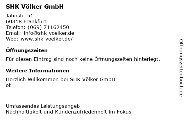 | Öffnungszeiten SHK Völker GmbH in Frankfurt anzeigen | |