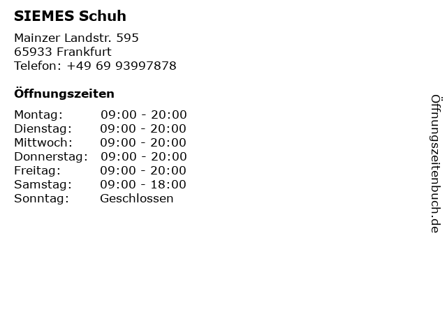 | Öffnungszeiten SIEMES Schuh in Frankfurt anzeigen | |