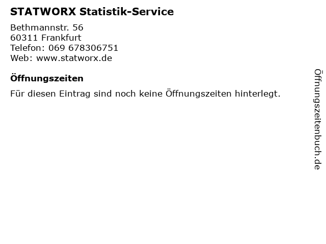 | Öffnungszeiten STATWORX Statistik-Service in Frankfurt anzeigen | |