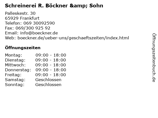 4 R. Böckner & Sohn GmbH Laden Ausstellung Weru-Studio (Entfernung: 1,82 km) Alt Sossenheim 42, 65936 Frankfurt am Main 6 Depping & Sohn GmbH, Erich Containerdienst, Erdbau, Recyclinghof (Entfernung: 2,89 km) Katharina-Paulus-Str. 1, 65760 Eschborn |