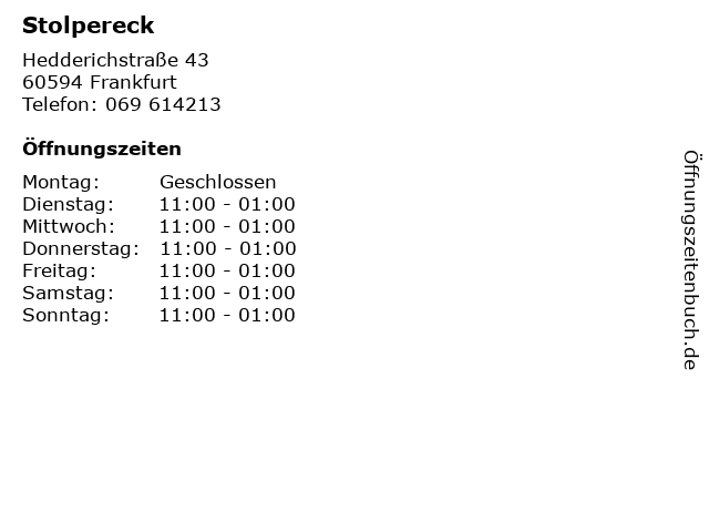 | Öffnungszeiten Stolpereck in Frankfurt anzeigen | |
