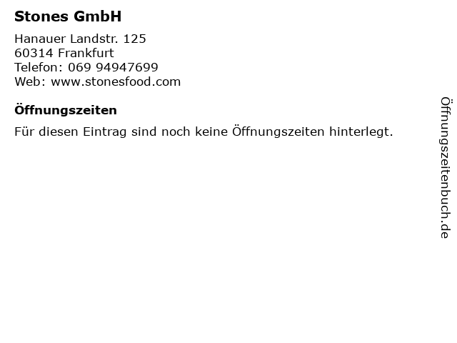 | Öffnungszeiten Stones GmbH in Frankfurt anzeigen | |