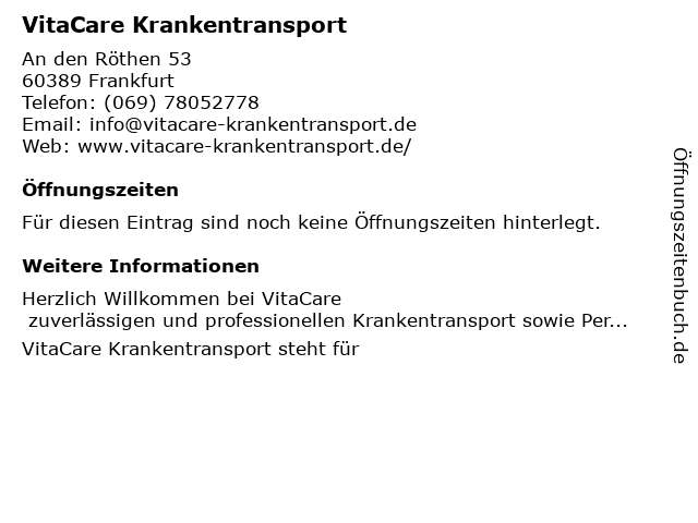 | Öffnungszeiten VitaCare Krankentransport in Frankfurt anzeigen | |